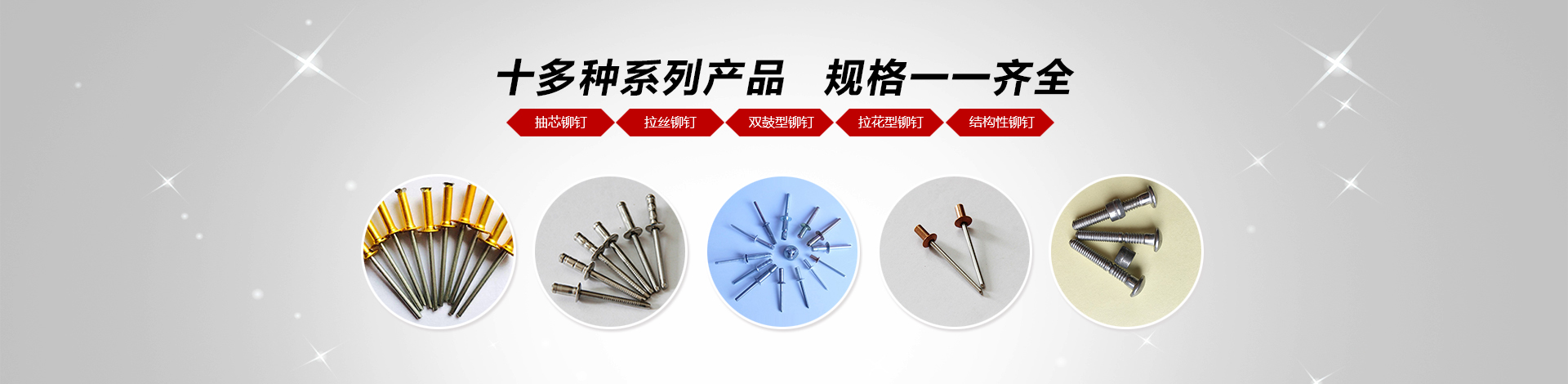 我們主要產(chǎn)品有:2.4-6.4的圓頭,沉頭(平頭),開(kāi)口,封閉系列抽芯鉚釘(拉釘),還有燈籠鉚釘,拉絲鉚釘,雙鼓型鉚釘,拉花型鉚釘?shù)鹊冉Y(jié)構(gòu)性鉚釘,材質(zhì)有鋁,不銹鋼,鐵,銅;還有M3-M12的平頭,沉頭,小頭系列鉚螺母,有圓桿型、帶槽型、六角型(半六角)、盲孔型等,材質(zhì)有鋁,不銹鋼,鐵,銅。